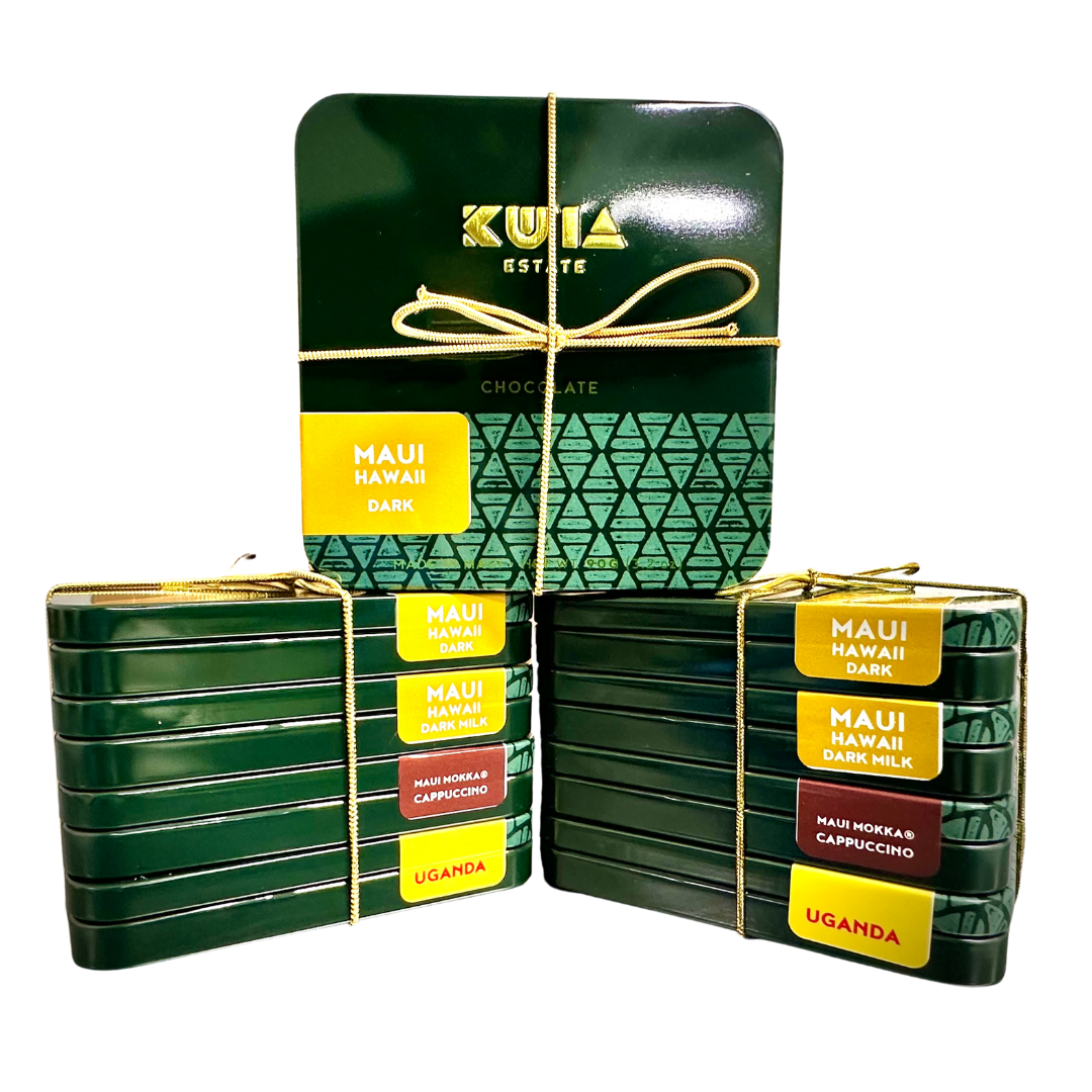 All four of these 18 piece chocolate tins feature cacao from unique single origins that have won recent awards. The first three tins of chocolate are from our own cacao farm in Lahaina, Maui.
