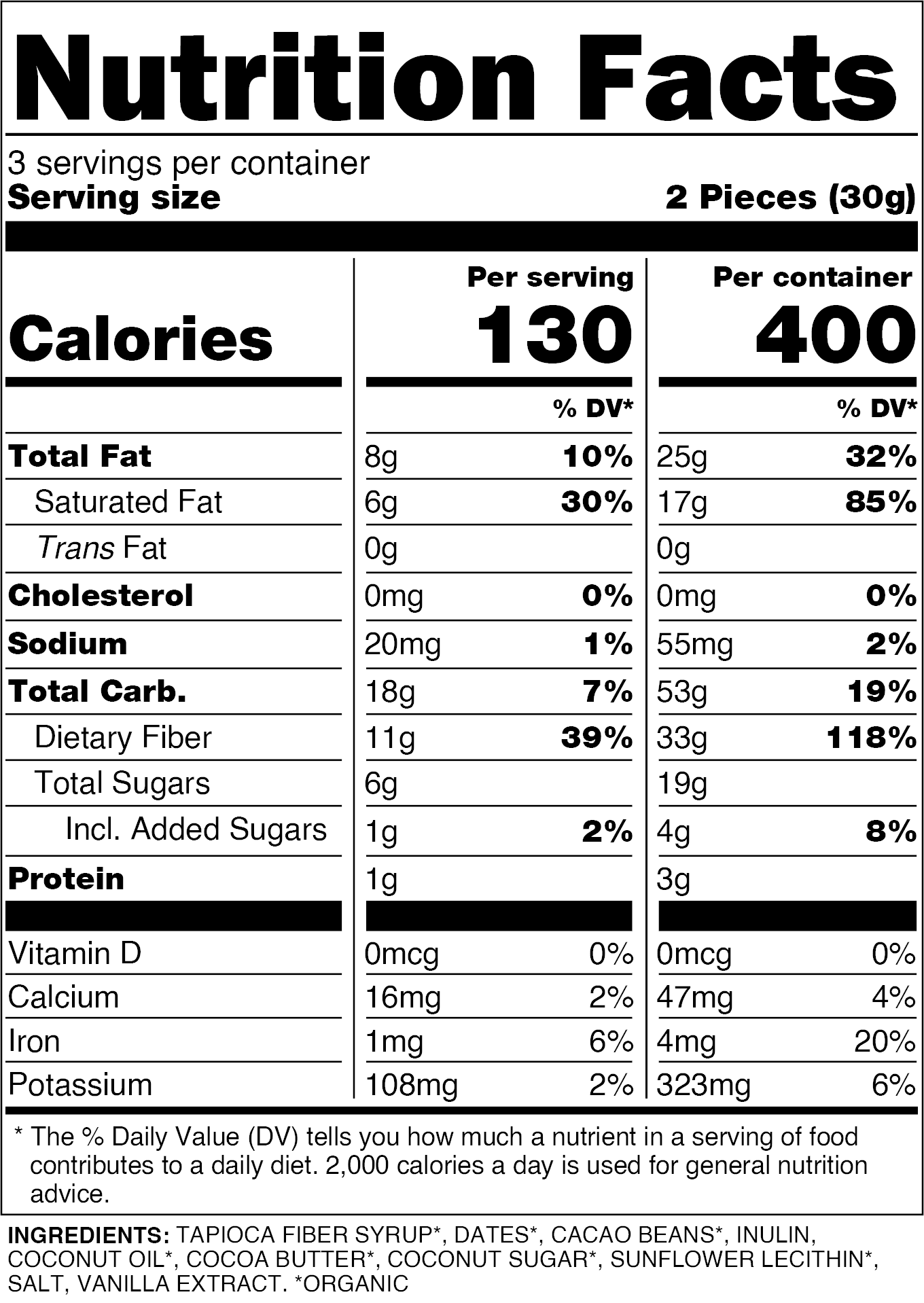 Ingredients: Tapioca fiber syrup, dates, cacao beans, inulin, coconut oil, cocoa butter, coconut sugar, sunflower lecithin, salt, vanilla extract