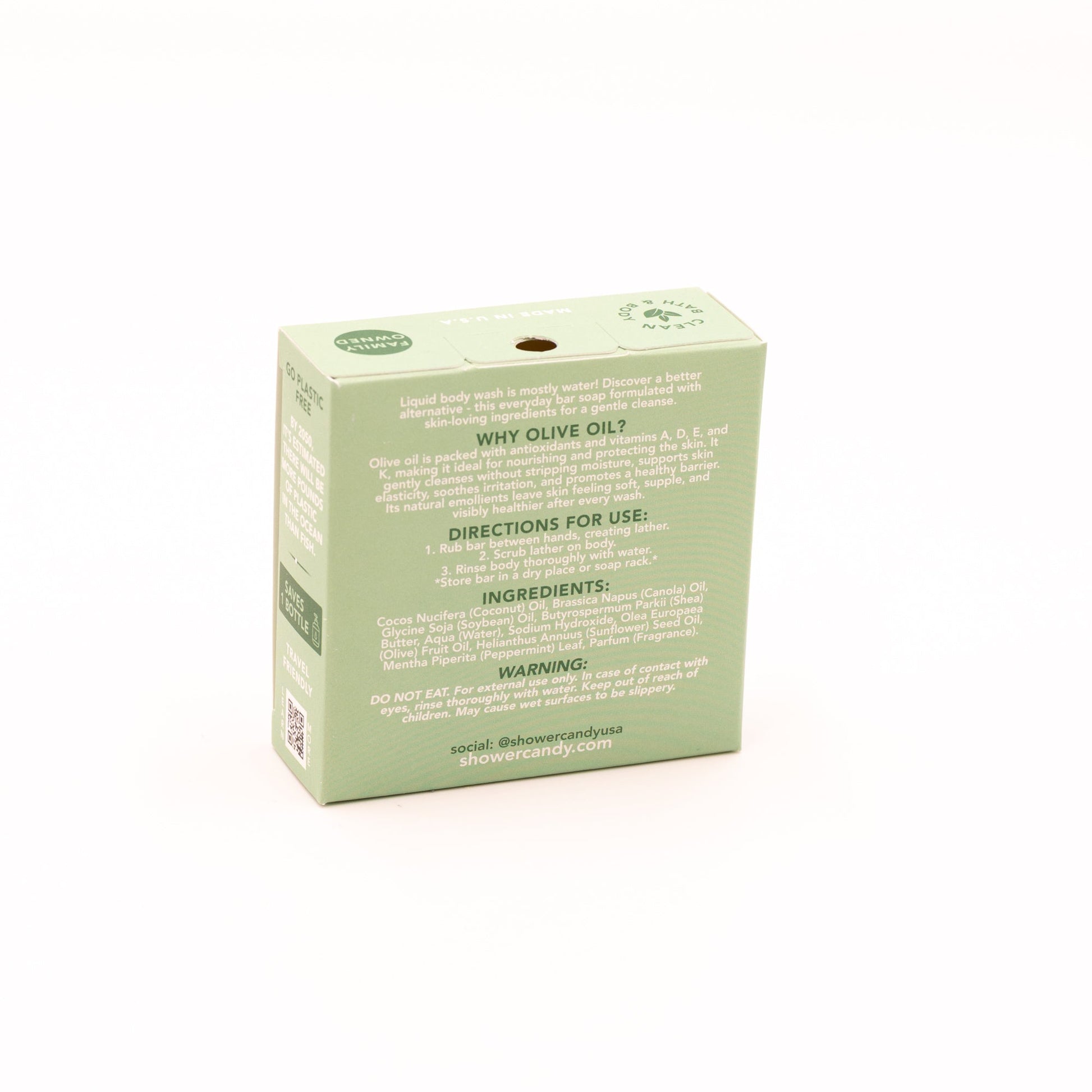 Cocos Nucifera (Coconut) Oil, Brassica Napus (Canola) Oil, Glycine Soja (Soybean) Oil, Butyrospermum Parkii (Shea) Butter, Aqua (Water), Sodium Hydroxide, Olea Europaea (Olive) Fruit Oil, Helianthus Annuus (Sunflower) Seed Oil, Mentha Piperita (Peppermint) Leaf, Parfum (Fragrance). WARNING: DO NOT EAT. For external use only. In case of contact with eyes, rinse thoroughly with water. Keep out of reach of children. May cause wet surfaces to be slippery.