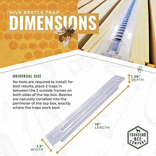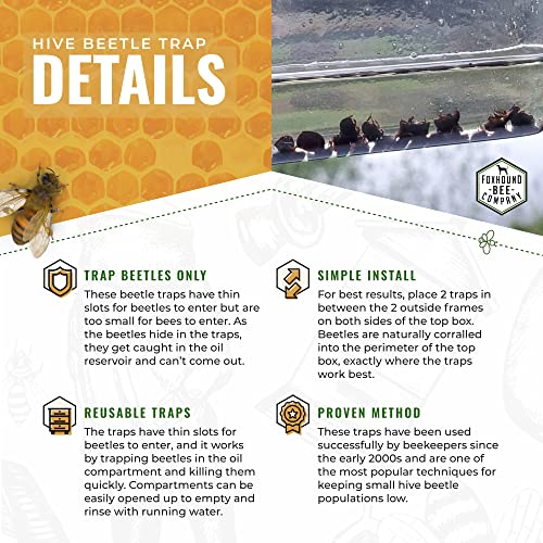 These reusable small hive beetle traps for trapping beetles inside of a beehive without using any harsh chemicals inside the hive. Each trap works to catch beetles and prevents them from getting outside the trap and laying eggs. The reusable traps are halfway filled with food-grade oil and closed. They are hung between two frames in a beehive in the top super or box. As beetles hide from the bees, they are forced into the trap and killed.