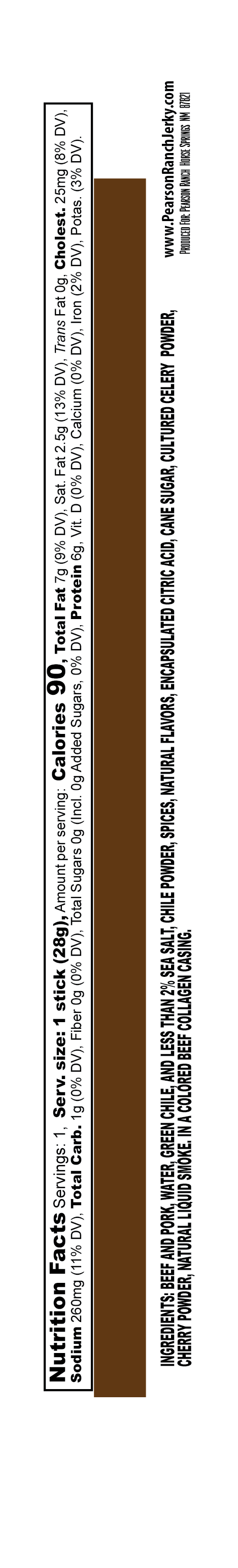 Looking for that distinctive Southwest Green Chili flavor. This stick is the one for you. Our Green Chile Beef & Pork Snack Stick is made with authentic New Mexico Green Chile and full of flavor and spice. (1 oz)