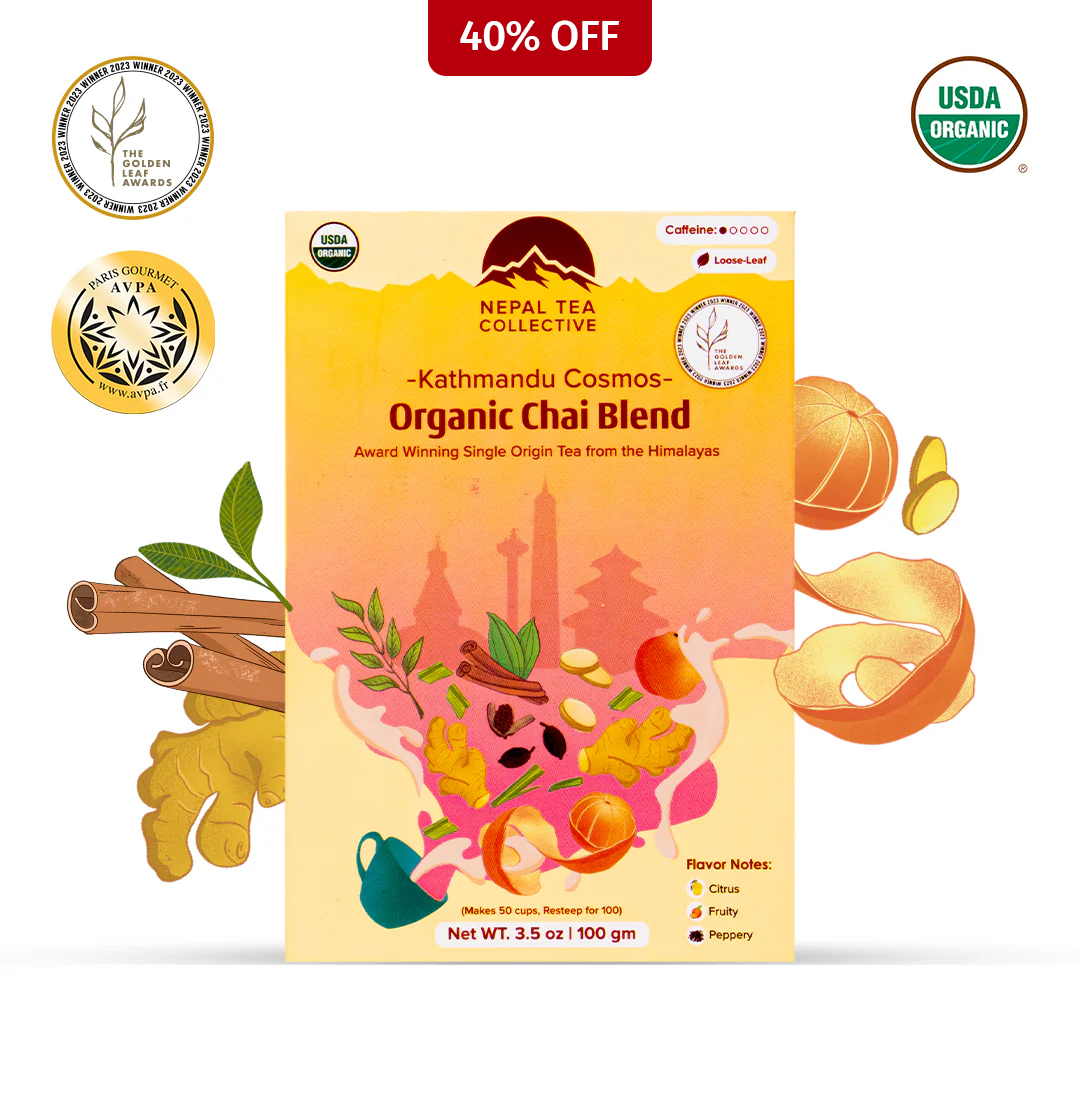 Kathmandu Cosmos is a medium-bodied herbal tea blend made with golden tips tea, blending sweet citrus notes with aromatic ginger and cardamom for a perfectly balanced heritage experience.