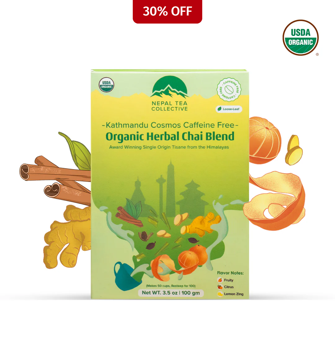 Kathmandu Cosmos Decaf is a medium-bodied, naturally decaffeinated herbal blend with sweet citrus notes and aromatic spices like ginger and cardamom, offering a heritage-rich, caffeine-free experience.