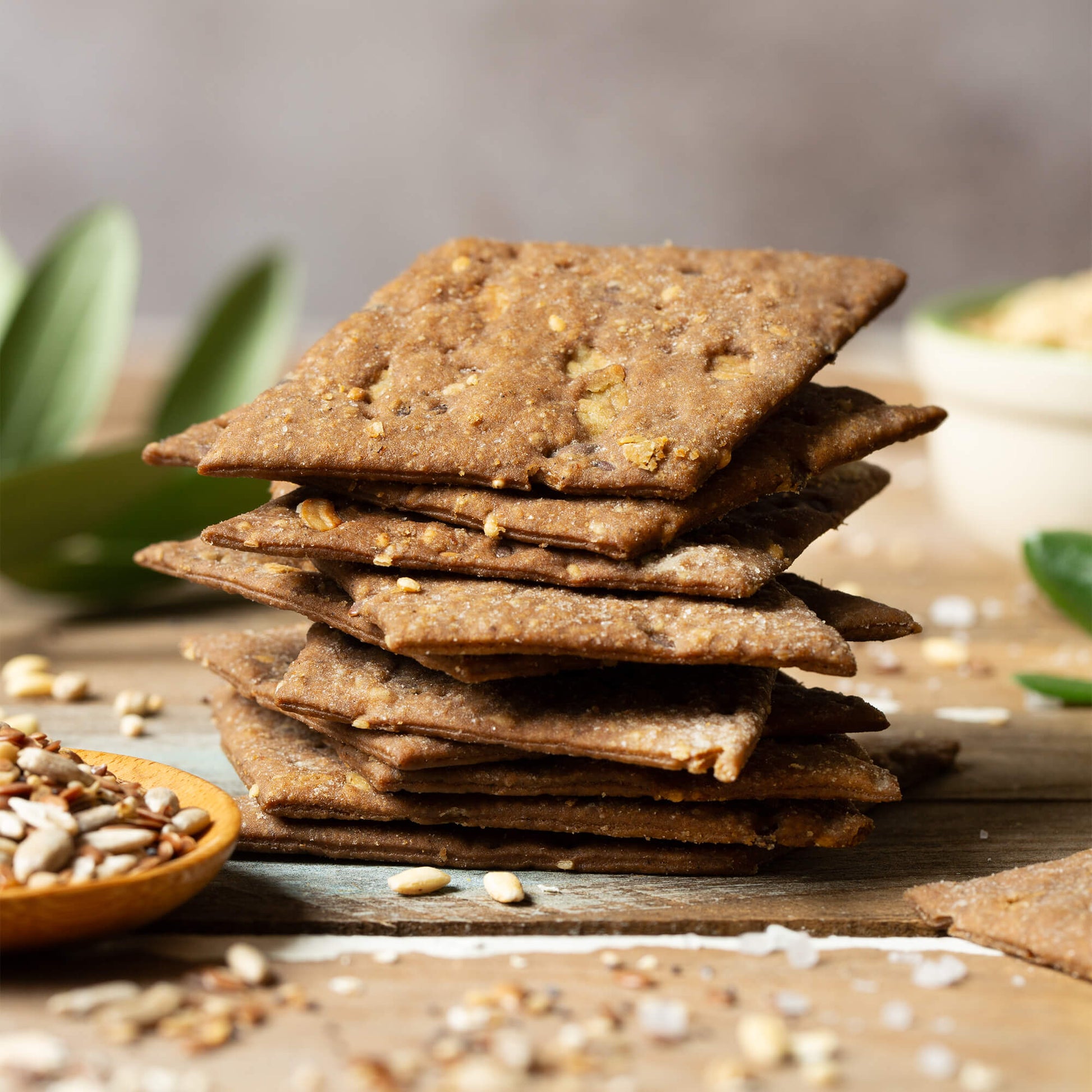 Our Multigrain Crackers are as crispy, crumbly, and tasty as those of Mr. Bent, but they have an extra gear: with wheat, rye, barley and oat flour, sesame, flaxseed, and sunflower seeds, their bold flavor goes well with every filling and seasoning. However, we also recommend you to try them as a handy snack to take with you for a delicious break.