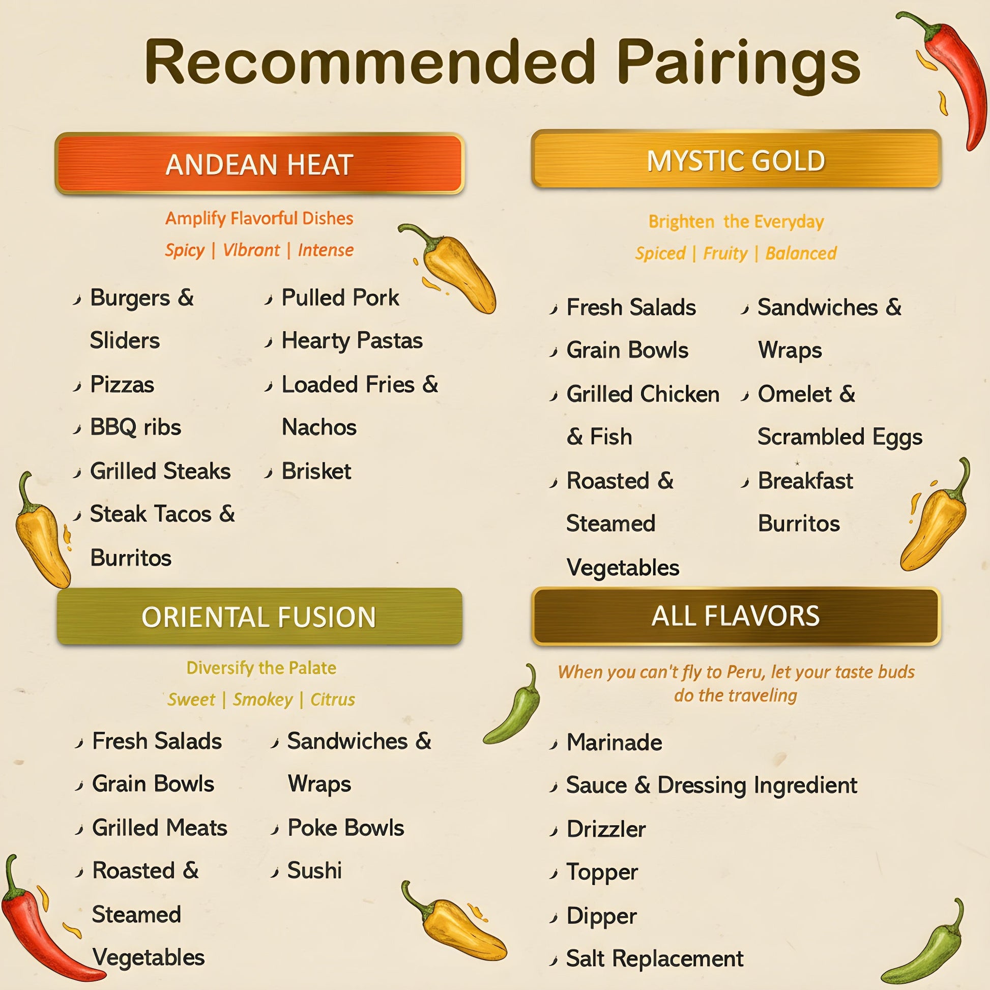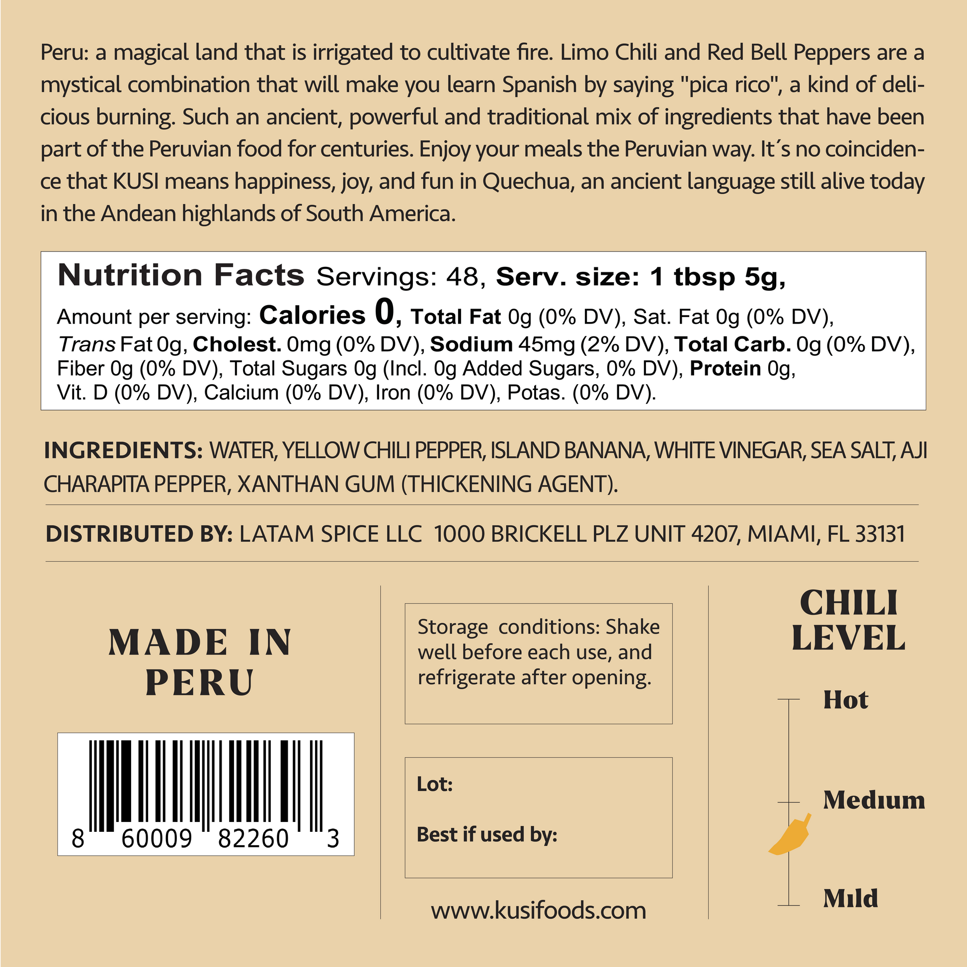 A uniquely sweet and spicy Peruvian mild sauce that blends the fiery heat of ají amarillo with the tropical smoothness of island bananas and a spark of rare ají charapita. This vibrant sauce is both bold and balanced — sweet, spicy, and unmistakably Peruvian. Crafted from traditional Amazonian ingredients, it delivers a one-of-a-kind flavor you won’t forget.