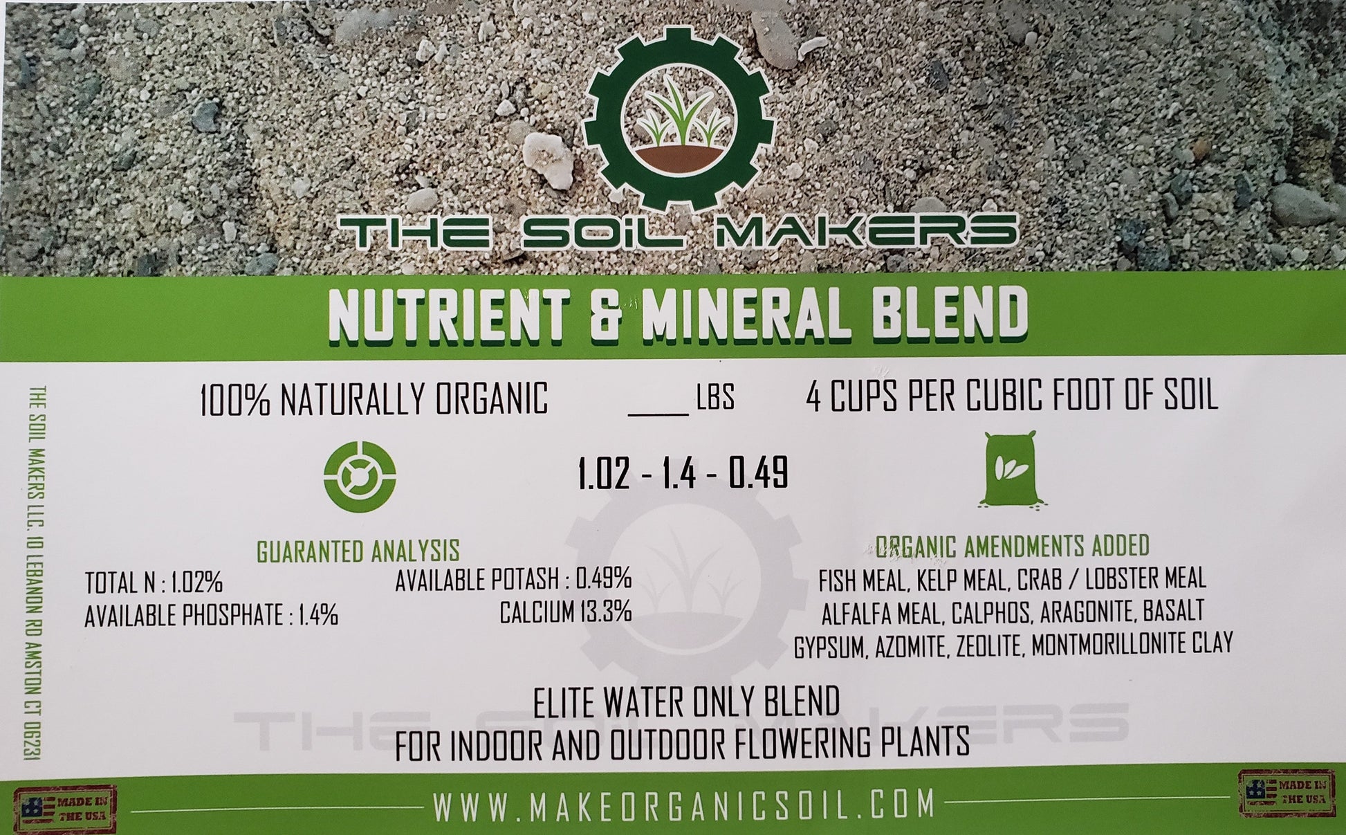 Kelp Meal, Crab Meal, Fish Meal, Alfalfa Meal, Fertoz and bolstered by Naturally Mined Minerals such as Gypsum pellets, Azomite rock flour, Aragonite shell flour, Basalt rock dust, Calcium Montmorillonite Clay, and Zeolite.