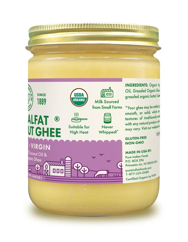A 50/50 blend of Organic Grass-fed Ghee and Organic Virgin Coconut Oil. Blending coconut oil with ghee naturally increases the smoke point, making our Coconut Ghee ideal for higher-heat cooking. It adds delicate, exquisite flavor to all of your favorite foods and recipes without an overpowering coconut flavor.