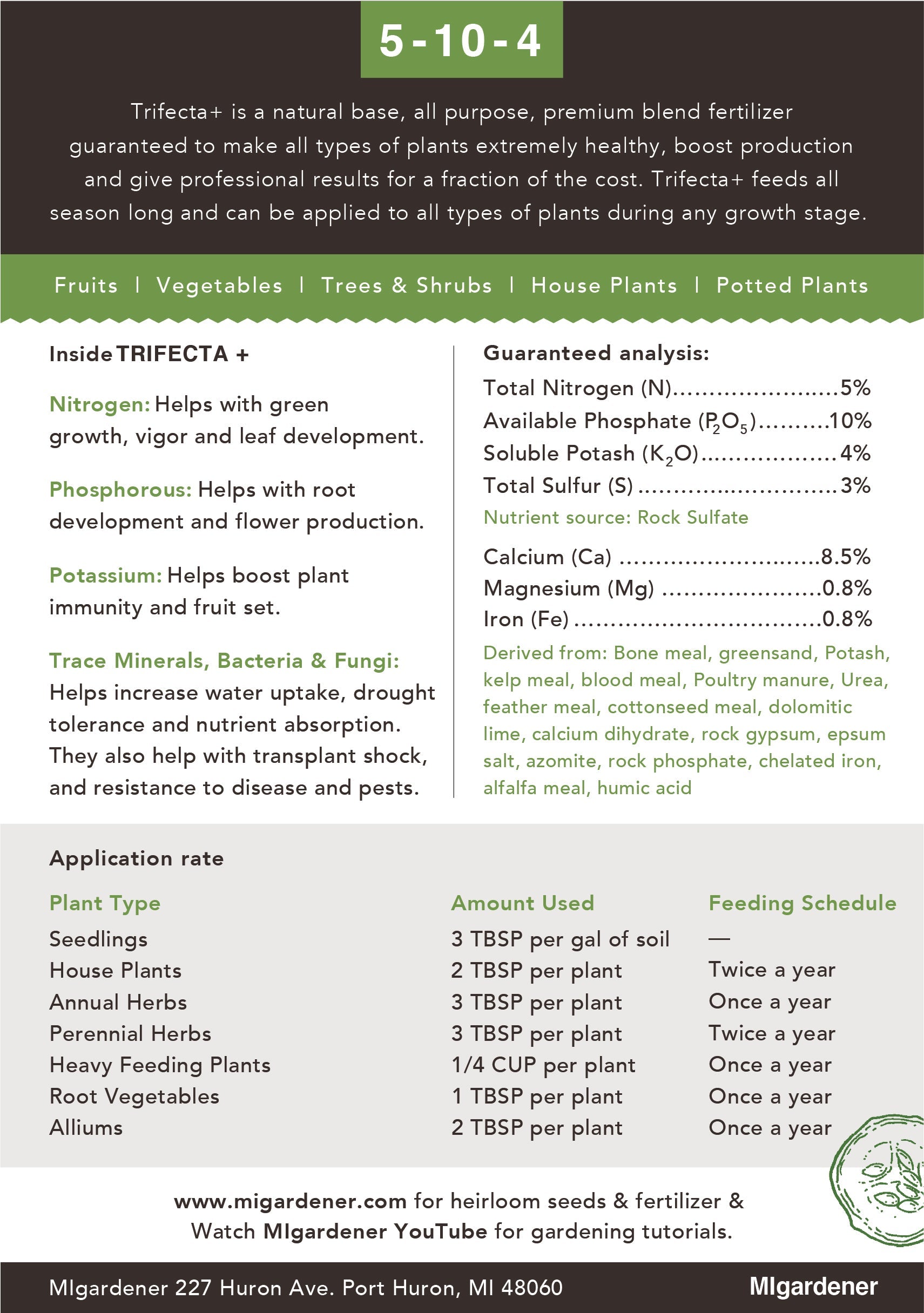 Trifecta is a natural base, premium blend fertilizer. It lasts all year long (if properly applied) and will increase flowering production as well as root growth, plant health, and produce larger, healthier, more nutrient-rich vegetables. Trifecta contains fast-acting and slow-release nutrients, as well as over 70 trace mineral micronutrients and beneficial bacteria and fungi! For a well rounded all purpose fertilizer!